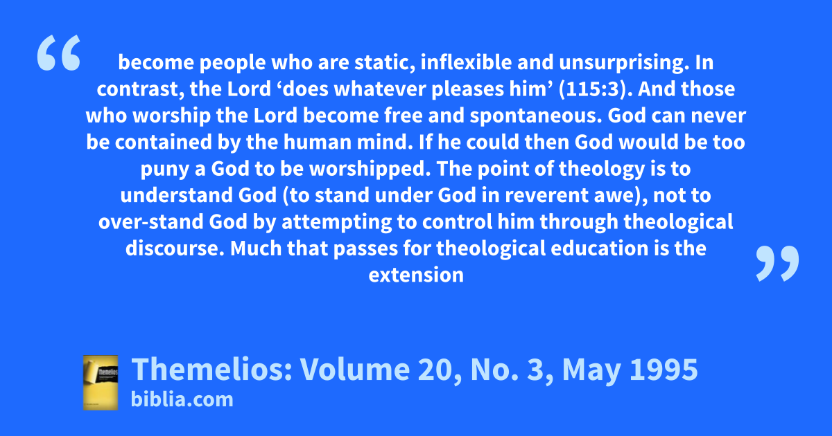 become people who are static, inflexible and unsurprising. In contrast, the Lord ‘does whatever pleases him’ (115:3). And those who worship the Lord become free and spontaneous. God can never be contained by the human mind. If he could then God would be too puny a God to be worshipped. The point of theology is to understand God (to stand under God in reverent awe), not to over-stand God by attempting to control him through theological discourse. Much that passes for theological education is the extension