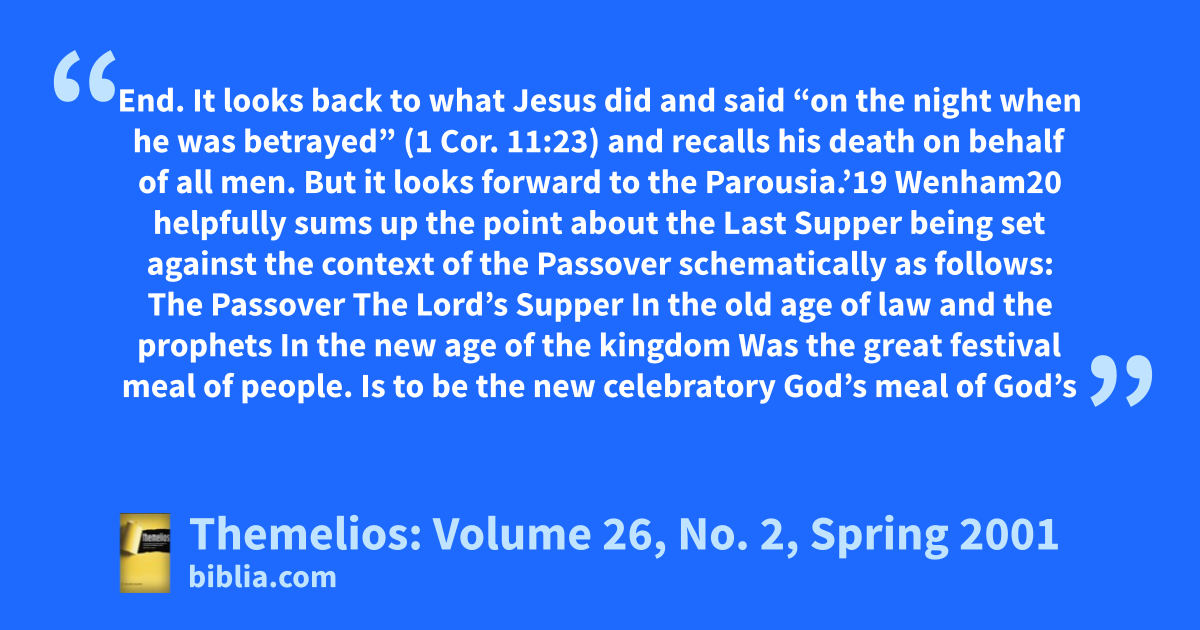 End. It looks back to what Jesus did and said “on the night when he was betrayed” (1 Cor. 11:23) and recalls his death on behalf of all men. But it looks forward to the Parousia.’19 Wenham20 helpfully sums up the point about the Last Supper being set against the context of the Passover schematically as follows: The Passover The Lord’s Supper In the old age of law and the prophets In the new age of the kingdom Was the great festival meal of people. Is to be the new celebratory God’s meal of God’s