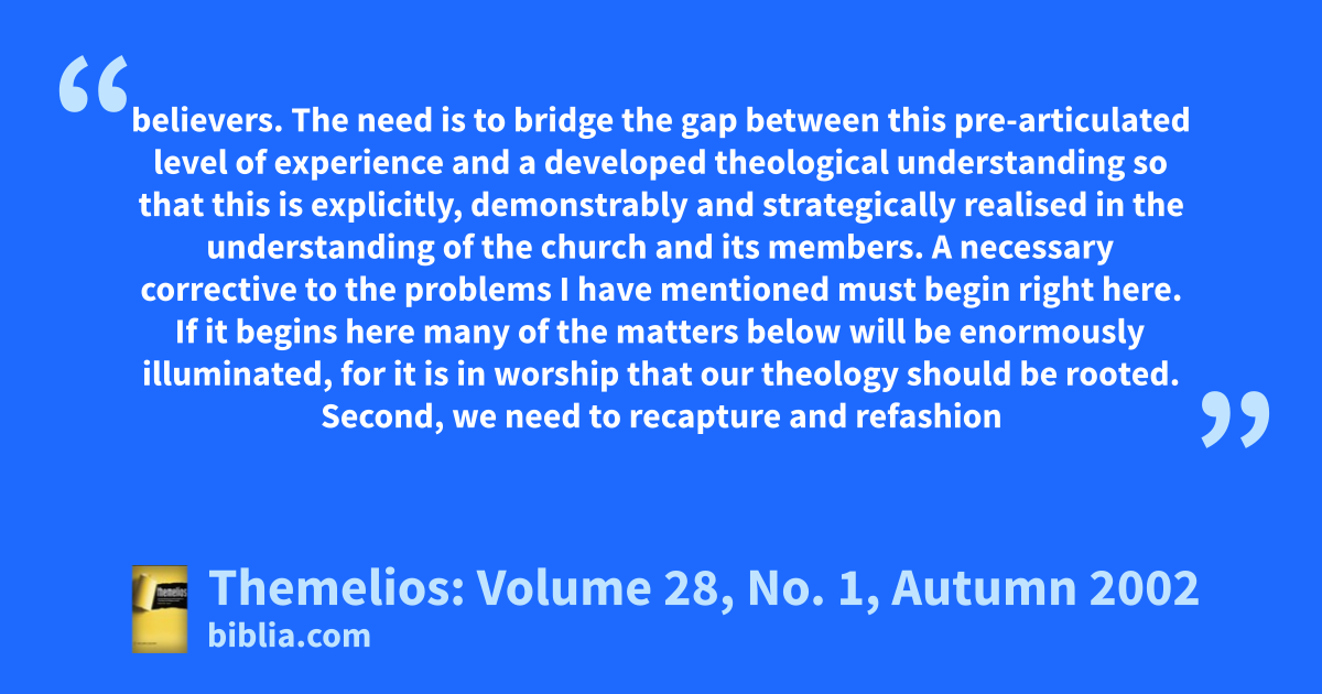 believers. The need is to bridge the gap between this pre-articulated level of experience and a developed theological understanding so that this is explicitly, demonstrably and strategically realised in the understanding of the church and its members. A necessary corrective to the problems I have mentioned must begin right here. If it begins here many of the matters below will be enormously illuminated, for it is in worship that our theology should be rooted. Second, we need to recapture and refashion