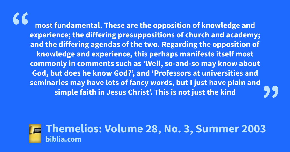 most fundamental. These are the opposition of knowledge and experience; the differing presuppositions of church and academy; and the differing agendas of the two. Regarding the opposition of knowledge and experience, this perhaps manifests itself most commonly in comments such as ‘Well, so-and-so may know about God, but does he know God?’, and ‘Professors at universities and seminaries may have lots of fancy words, but I just have plain and simple faith in Jesus Christ’. This is not just the kind