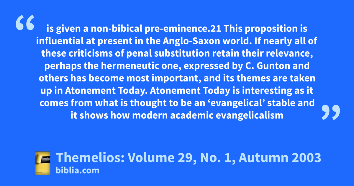 is given a non-bibical pre-eminence.21 This proposition is influential at present in the Anglo-Saxon world. If nearly all of these criticisms of penal substitution retain their relevance, perhaps the hermeneutic one, expressed by C. Gunton and others has become most important, and its themes are taken up in Atonement Today. Atonement Today is interesting as it comes from what is thought to be an ‘evangelical’ stable and it shows how modern academic evangelicalism