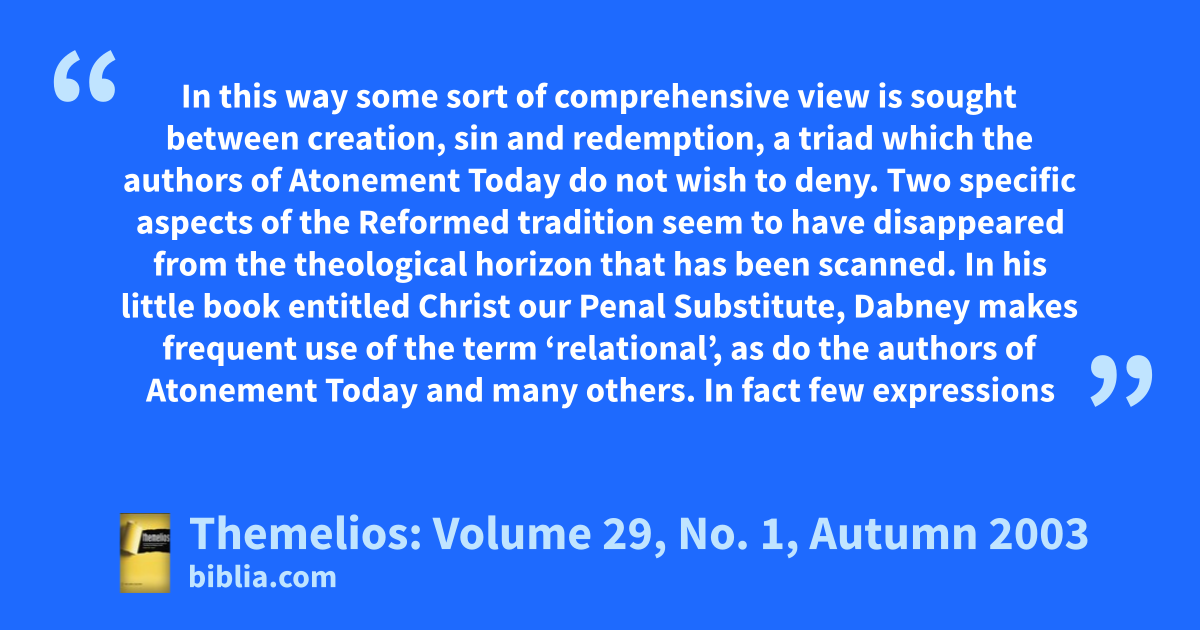 In this way some sort of comprehensive view is sought between creation, sin and redemption, a triad which the authors of Atonement Today do not wish to deny. Two specific aspects of the Reformed tradition seem to have disappeared from the theological horizon that has been scanned. In his little book entitled Christ our Penal Substitute, Dabney makes frequent use of the term ‘relational’, as do the authors of Atonement Today and many others. In fact few expressions