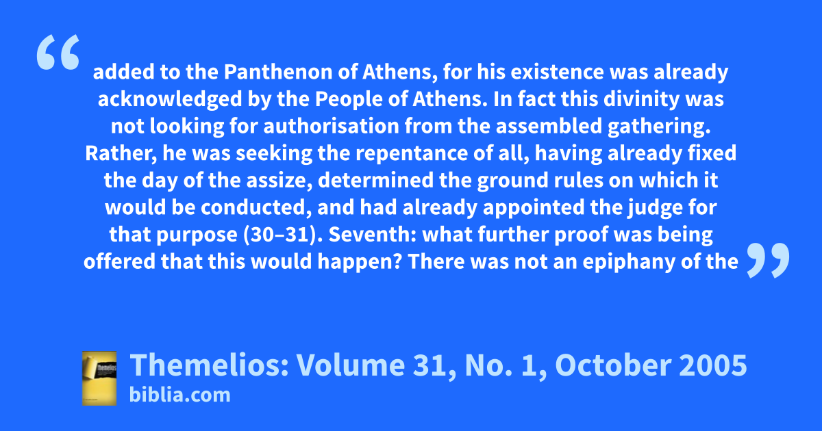 added to the Panthenon of Athens, for his existence was already acknowledged by the People of Athens. In fact this divinity was not looking for authorisation from the assembled gathering. Rather, he was seeking the repentance of all, having already fixed the day of the assize, determined the ground rules on which it would be conducted, and had already appointed the judge for that purpose (30–31). Seventh: what further proof was being offered that this would happen? There was not an epiphany of the