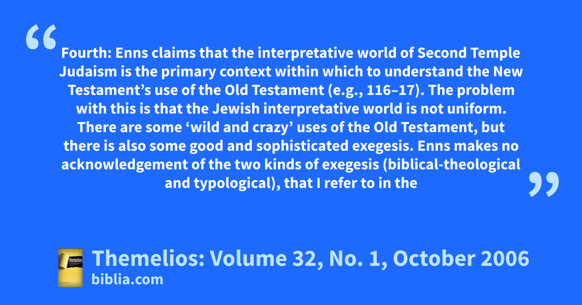 Fourth: Enns claims that the interpretative world of Second Temple Judaism is the primary context within which to understand the New Testament’s use of the Old Testament (e.g., 116–17). The problem with this is that the Jewish interpretative world is not uniform. There are some ‘wild and crazy’ uses of the Old Testament, but there is also some good and sophisticated exegesis. Enns makes no acknowledgement of the two kinds of exegesis (biblical-theological and typological), that I refer to in the