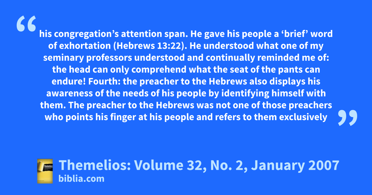 his congregation’s attention span. He gave his people a ‘brief’ word of exhortation (Hebrews 13:22). He understood what one of my seminary professors understood and continually reminded me of: the head can only comprehend what the seat of the pants can endure! Fourth: the preacher to the Hebrews also displays his awareness of the needs of his people by identifying himself with them. The preacher to the Hebrews was not one of those preachers who points his finger at his people and refers to them exclusively