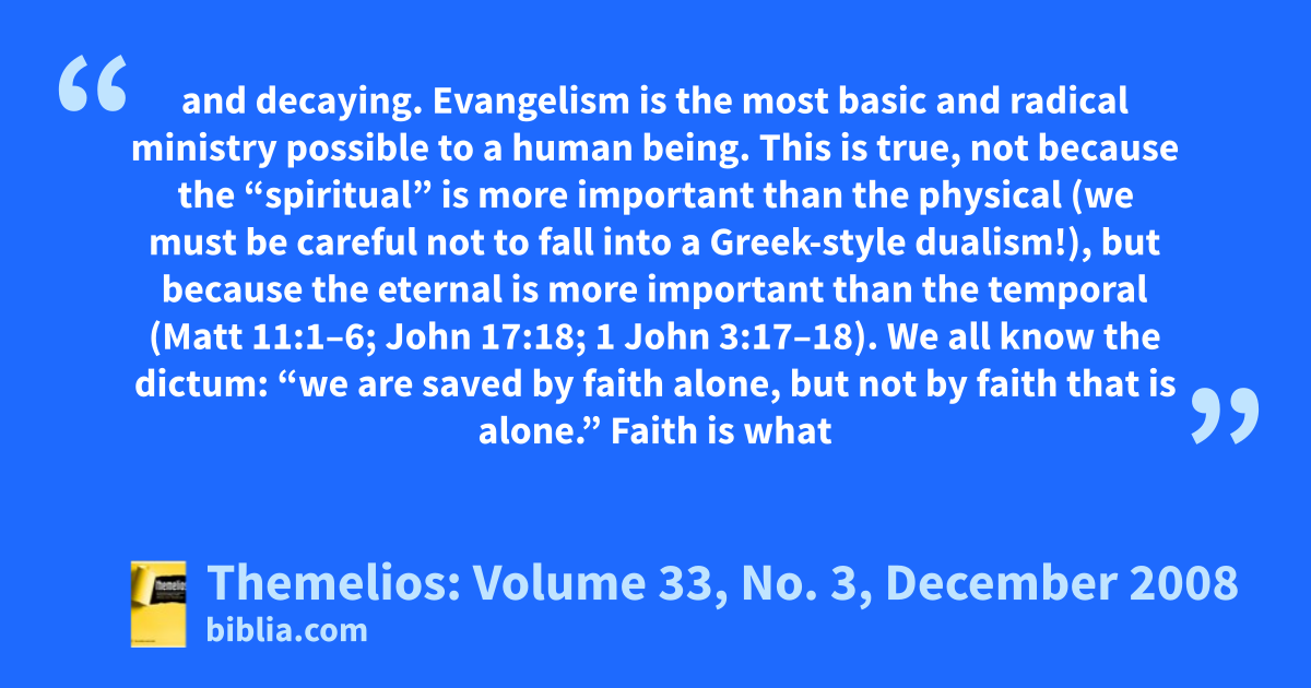 and decaying. Evangelism is the most basic and radical ministry possible to a human being. This is true, not because the “spiritual” is more important than the physical (we must be careful not to fall into a Greek-style dualism!), but because the eternal is more important than the temporal (Matt 11:1–6; John 17:18; 1 John 3:17–18). We all know the dictum: “we are saved by faith alone, but not by faith that is alone.” Faith is what