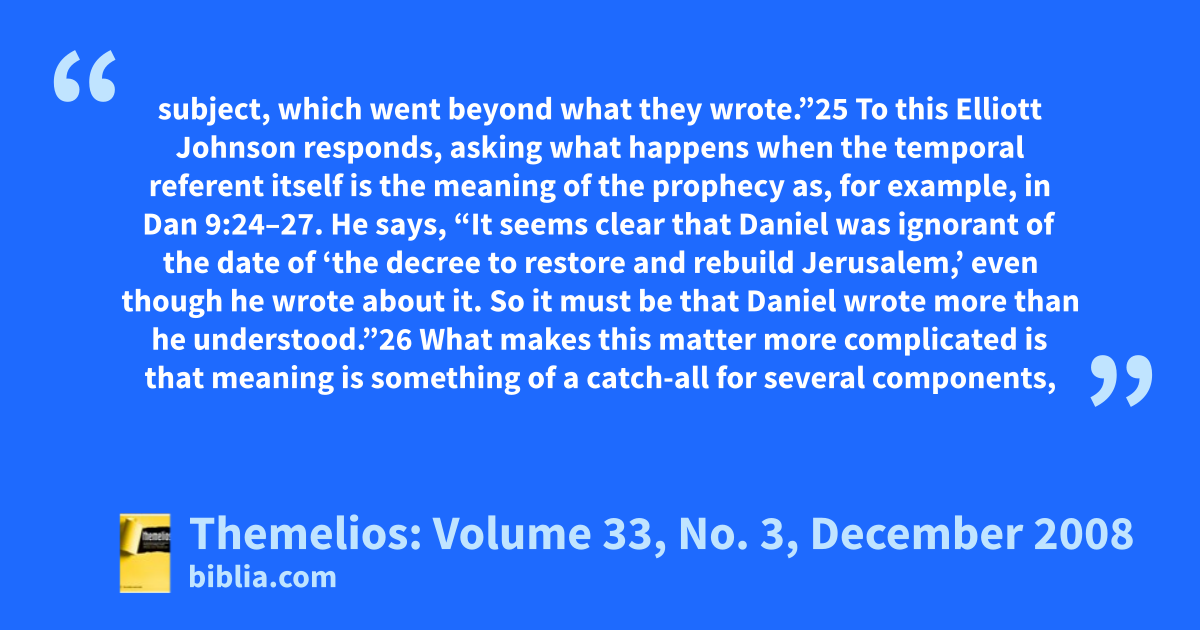 subject, which went beyond what they wrote.”25 To this Elliott Johnson responds, asking what happens when the temporal referent itself is the meaning of the prophecy as, for example, in Dan 9:24–27. He says, “It seems clear that Daniel was ignorant of the date of ‘the decree to restore and rebuild Jerusalem,’ even though he wrote about it. So it must be that Daniel wrote more than he understood.”26 What makes this matter more complicated is that meaning is something of a catch-all for several components,