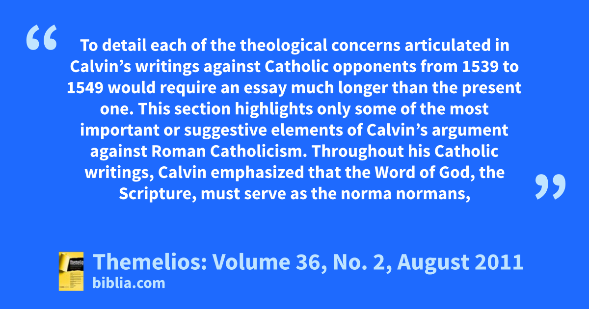 To detail each of the theological concerns articulated in Calvin’s writings against Catholic opponents from 1539 to 1549 would require an essay much longer than the present one. This section highlights only some of the most important or suggestive elements of Calvin’s argument against Roman Catholicism. Throughout his Catholic writings, Calvin emphasized that the Word of God, the Scripture, must serve as the norma normans,