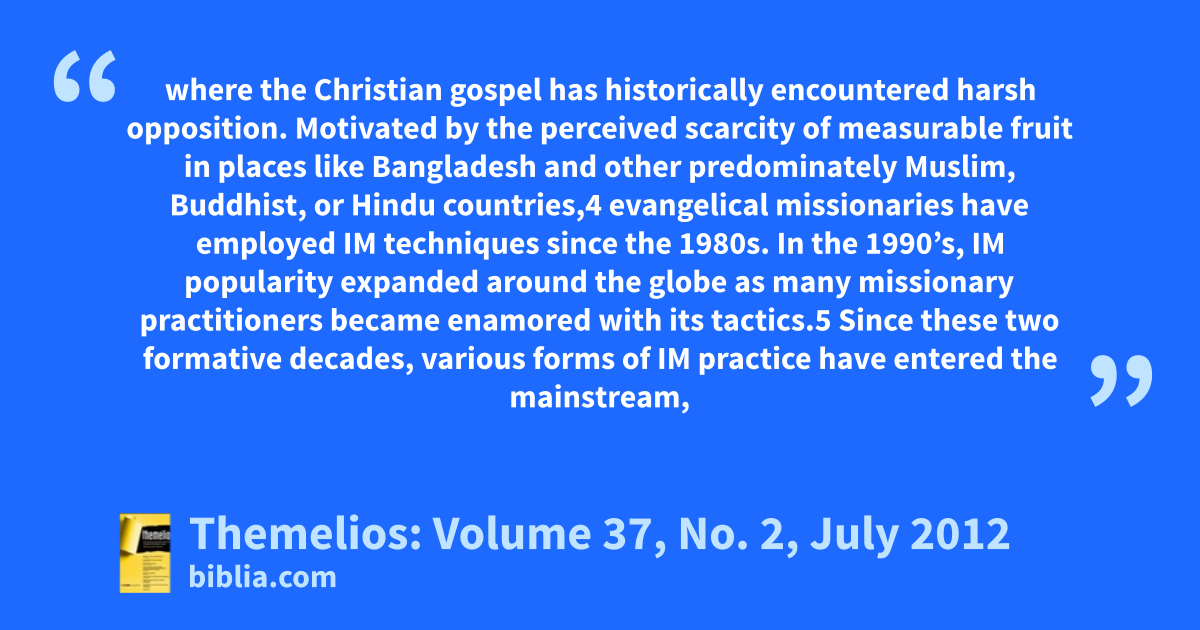 where the Christian gospel has historically encountered harsh opposition. Motivated by the perceived scarcity of measurable fruit in places like Bangladesh and other predominately Muslim, Buddhist, or Hindu countries,4 evangelical missionaries have employed IM techniques since the 1980s. In the 1990’s, IM popularity expanded around the globe as many missionary practitioners became enamored with its tactics.5 Since these two formative decades, various forms of IM practice have entered the mainstream,