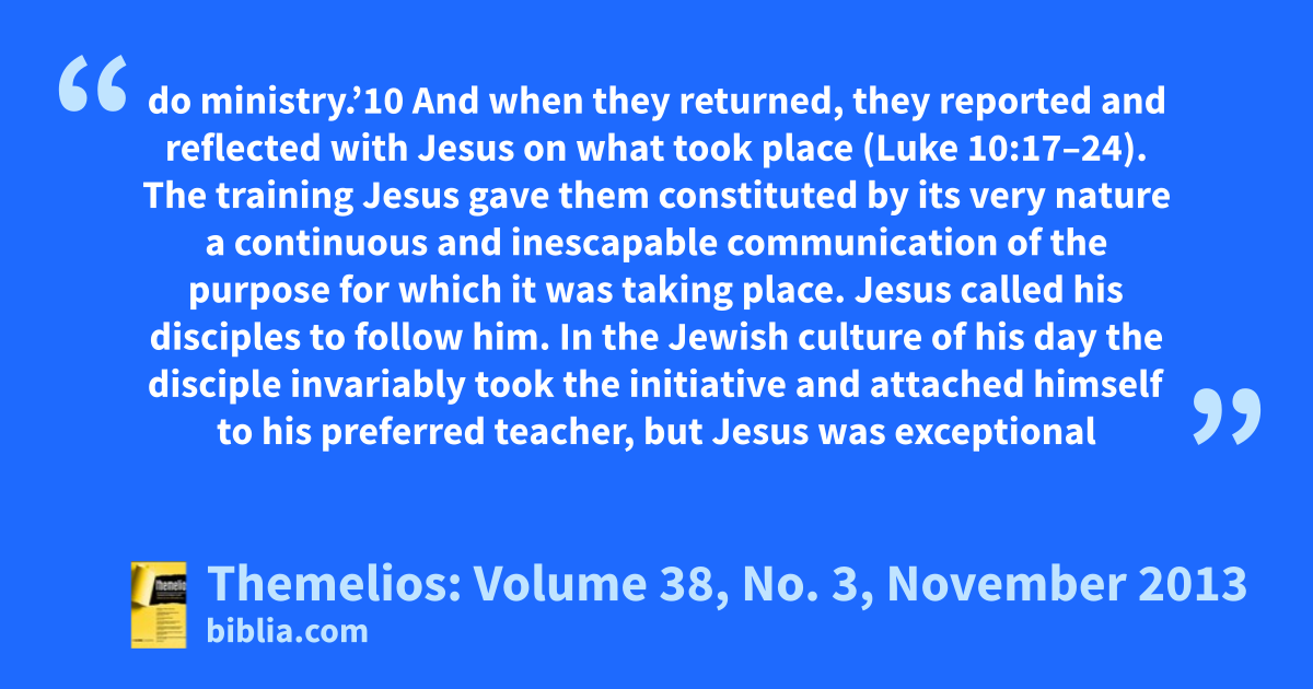 do ministry.’10 And when they returned, they reported and reflected with Jesus on what took place (Luke 10:17–24). The training Jesus gave them constituted by its very nature a continuous and inescapable communication of the purpose for which it was taking place. Jesus called his disciples to follow him. In the Jewish culture of his day the disciple invariably took the initiative and attached himself to his preferred teacher, but Jesus was exceptional