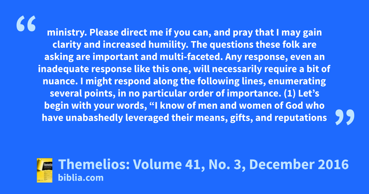 ministry. Please direct me if you can, and pray that I may gain clarity and increased humility. The questions these folk are asking are important and multi-faceted. Any response, even an inadequate response like this one, will necessarily require a bit of nuance. I might respond along the following lines, enumerating several points, in no particular order of importance. (1) Let’s begin with your words, “I know of men and women of God who have unabashedly leveraged their means, gifts, and reputations