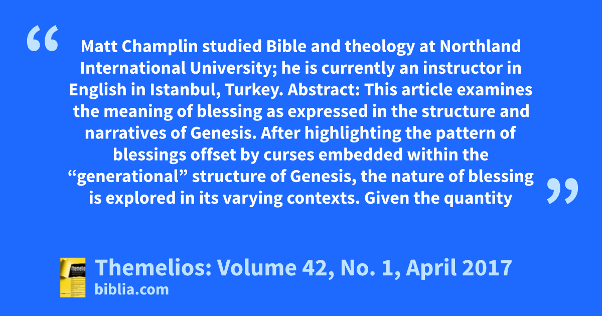 Matt Champlin studied Bible and theology at Northland International University; he is currently an instructor in English in Istanbul, Turkey. Abstract: This article examines the meaning of blessing as expressed in the structure and narratives of Genesis. After highlighting the pattern of blessings offset by curses embedded within the “generational” structure of Genesis, the nature of blessing is explored in its varying contexts. Given the quantity