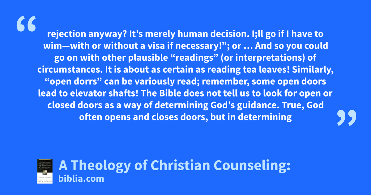 rejection anyway? It’s merely human decision. I;ll go if I have to wim—with or without a visa if necessary!”; or … And so you could go on with other plausible “readings” (or interpretations) of circumstances. It is about as certain as reading tea leaves! Similarly, “open dorrs” can be variously read; remember, some open doors lead to elevator shafts! The Bible does not tell us to look for open or closed doors as a way of determining God’s guidance. True, God often opens and closes doors, but in determining