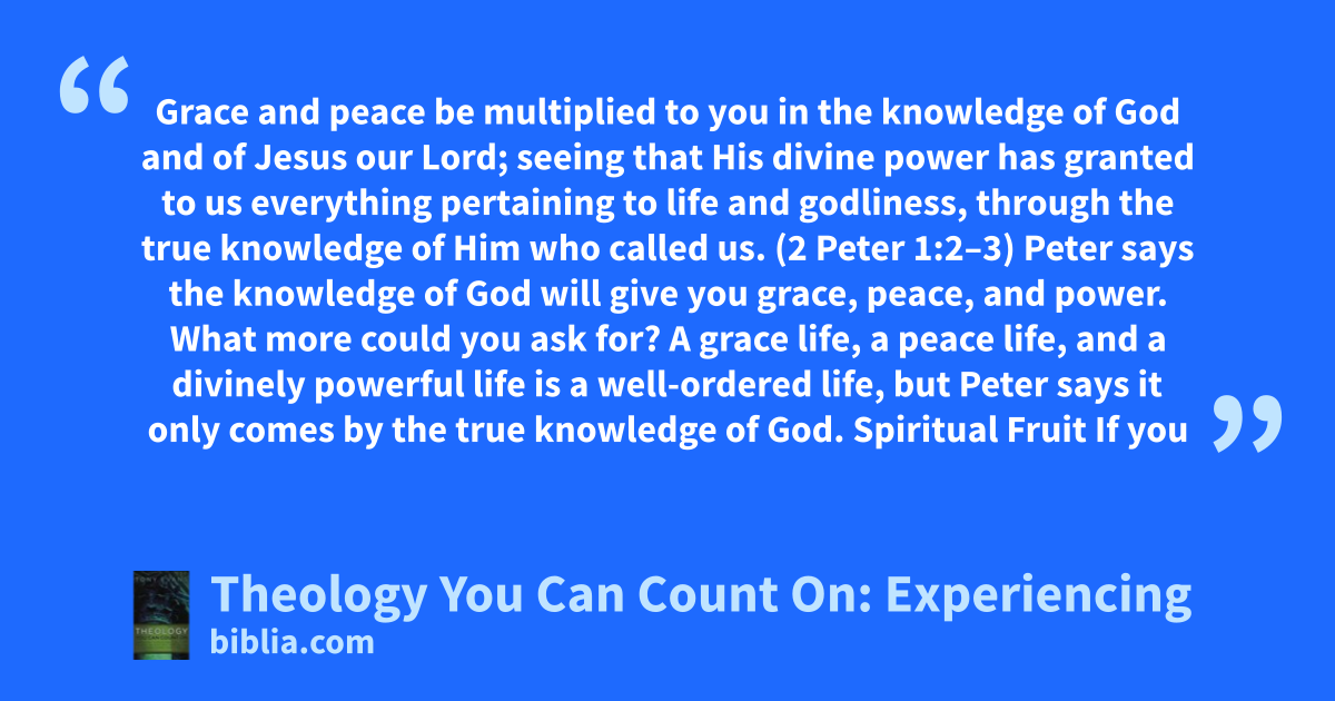 Grace and peace be multiplied to you in the knowledge of God and of Jesus our Lord; seeing that His divine power has granted to us everything pertaining to life and godliness, through the true knowledge of Him who called us. (2 Peter 1:2–3) Peter says the knowledge of God will give you grace, peace, and power. What more could you ask for? A grace life, a peace life, and a divinely powerful life is a well-ordered life, but Peter says it only comes by the true knowledge of God. Spiritual Fruit If you