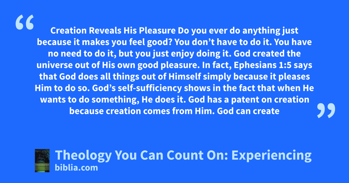 Creation Reveals His Pleasure Do you ever do anything just because it makes you feel good? You don’t have to do it. You have no need to do it, but you just enjoy doing it. God created the universe out of His own good pleasure. In fact, Ephesians 1:5 says that God does all things out of Himself simply because it pleases Him to do so. God’s self-sufficiency shows in the fact that when He wants to do something, He does it. God has a patent on creation because creation comes from Him. God can create