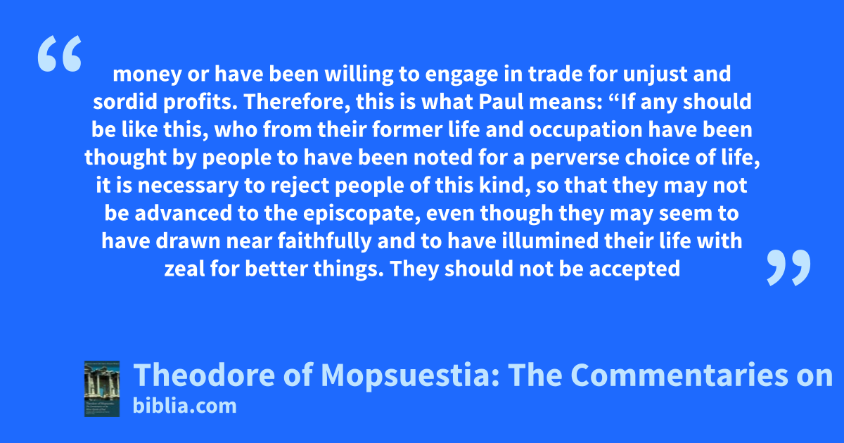 money or have been willing to engage in trade for unjust and sordid profits. Therefore, this is what Paul means: “If any should be like this, who from their former life and occupation have been thought by people to have been noted for a perverse choice of life, it is necessary to reject people of this kind, so that they may not be advanced to the episcopate, even though they may seem to have drawn near faithfully and to have illumined their life with zeal for better things. They should not be accepted