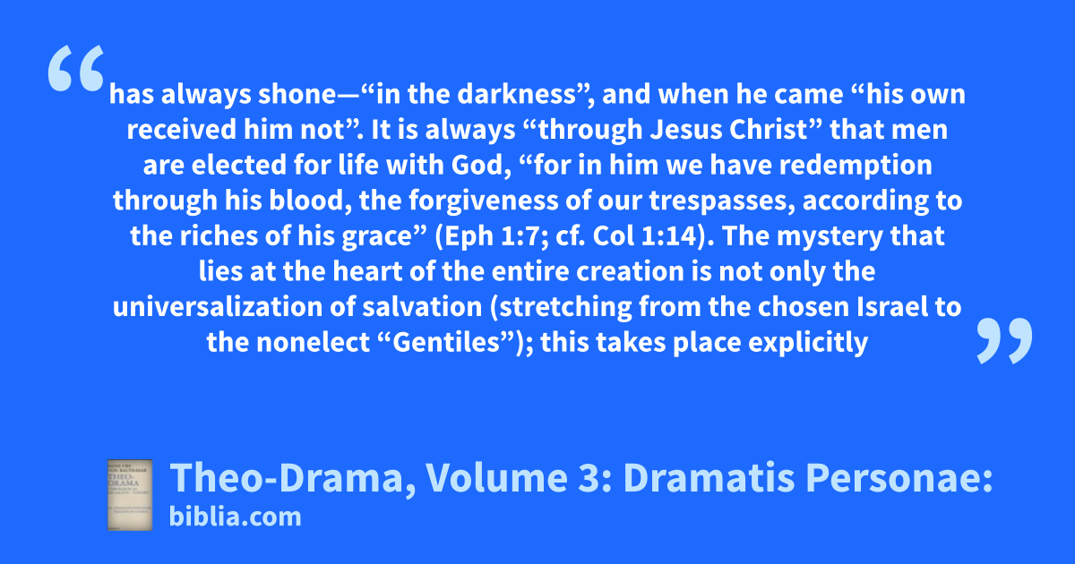 has always shone—“in the darkness”, and when he came “his own received him not”. It is always “through Jesus Christ” that men are elected for life with God, “for in him we have redemption through his blood, the forgiveness of our trespasses, according to the riches of his grace” (Eph 1:7; cf. Col 1:14). The mystery that lies at the heart of the entire creation is not only the universalization of salvation (stretching from the chosen Israel to the nonelect “Gentiles”); this takes place explicitly