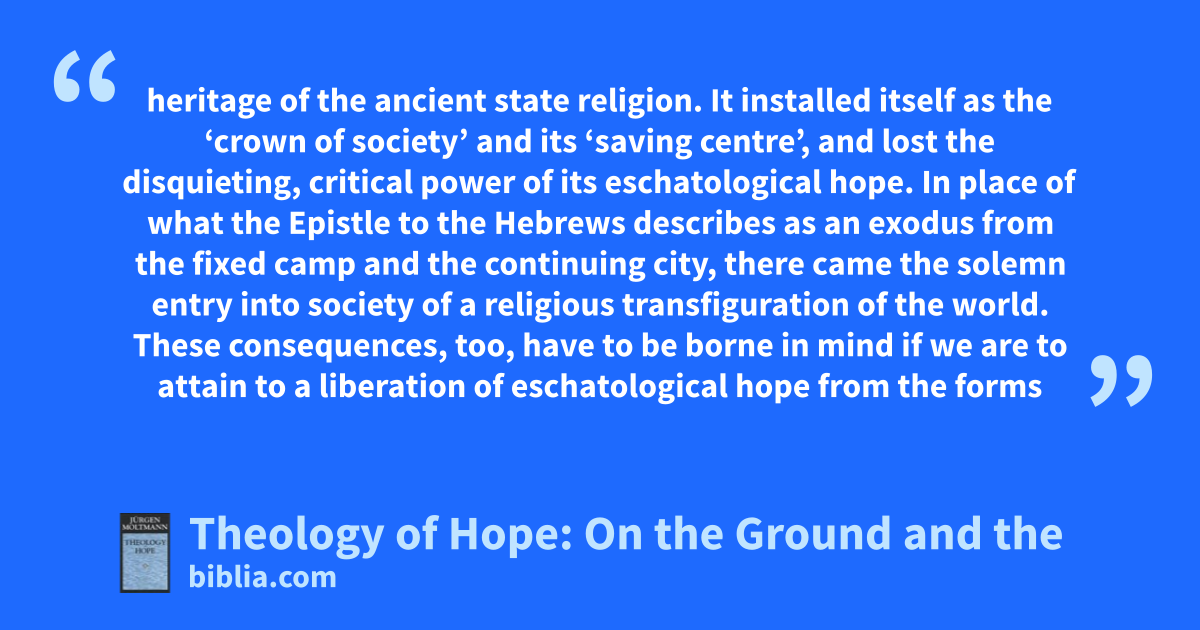Jürgen Moltmann shows how theology can begin in hope and be considered as a theme in an eschatological light. He digs deep into the foundations of the hope of Christian faith and into the exercise of this hope in thought and action in the world today. The various critical discussions should not be understood as rejections and condemnations. They are necessary conversations on a common subject...