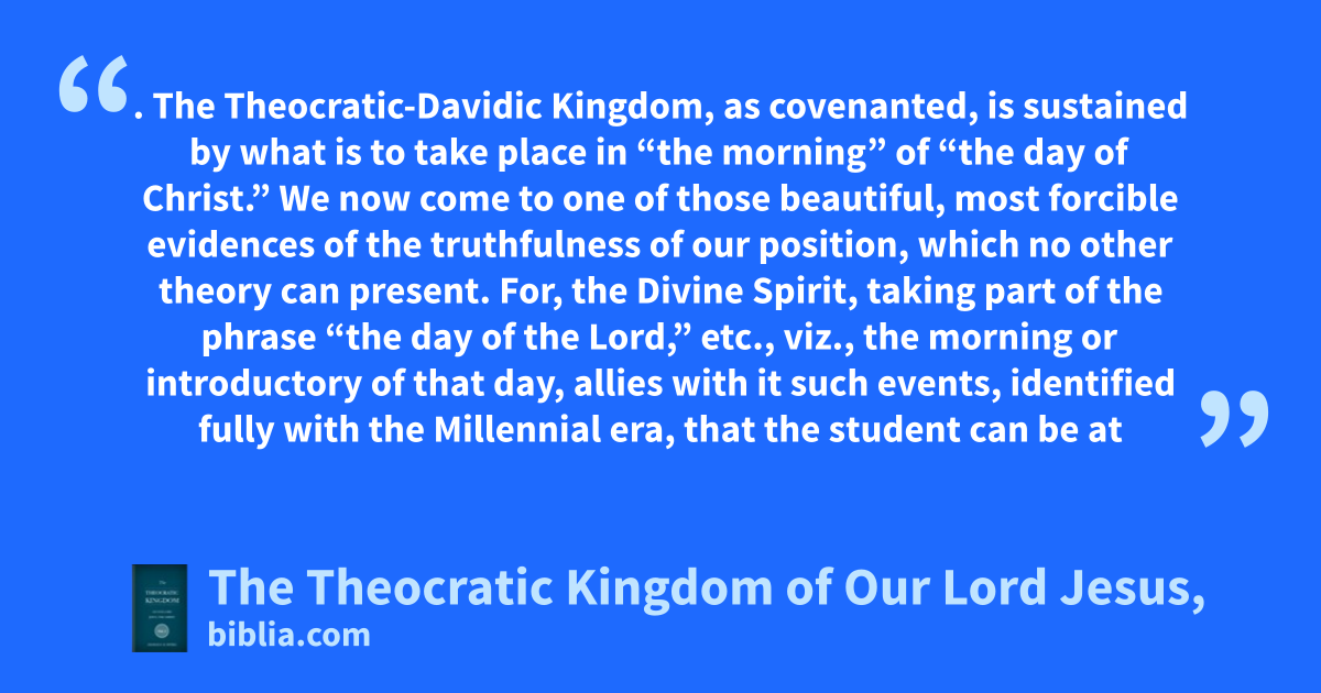 . The Theocratic-Davidic Kingdom, as covenanted, is sustained by what is to take place in “the morning” of “the day of Christ.” We now come to one of those beautiful, most forcible evidences of the truthfulness of our position, which no other theory can present. For, the Divine Spirit, taking part of the phrase “the day of the Lord,” etc., viz., the morning or introductory of that day, allies with it such events, identified fully with the Millennial era, that the student can be at