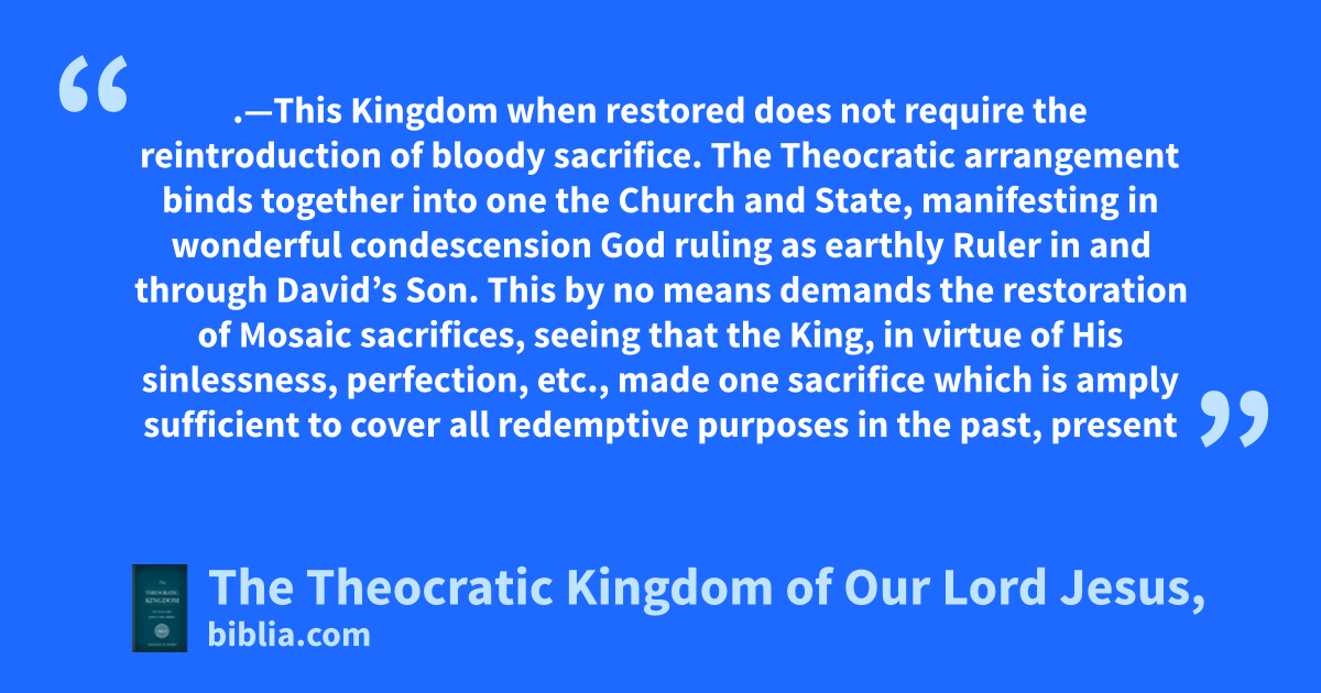 .—This Kingdom when restored does not require the reintroduction of bloody sacrifice. The Theocratic arrangement binds together into one the Church and State, manifesting in wonderful condescension God ruling as earthly Ruler in and through David’s Son. This by no means demands the restoration of Mosaic sacrifices, seeing that the King, in virtue of His sinlessness, perfection, etc., made one sacrifice which is amply sufficient to cover all redemptive purposes in the past, present
