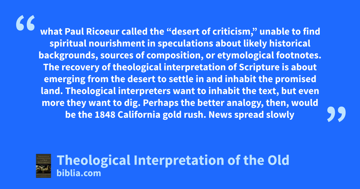 what Paul Ricoeur called the “desert of criticism,” unable to find spiritual nourishment in speculations about likely historical backgrounds, sources of composition, or etymological footnotes. The recovery of theological interpretation of Scripture is about emerging from the desert to settle in and inhabit the promised land. Theological interpreters want to inhabit the text, but even more they want to dig. Perhaps the better analogy, then, would be the 1848 California gold rush. News spread slowly