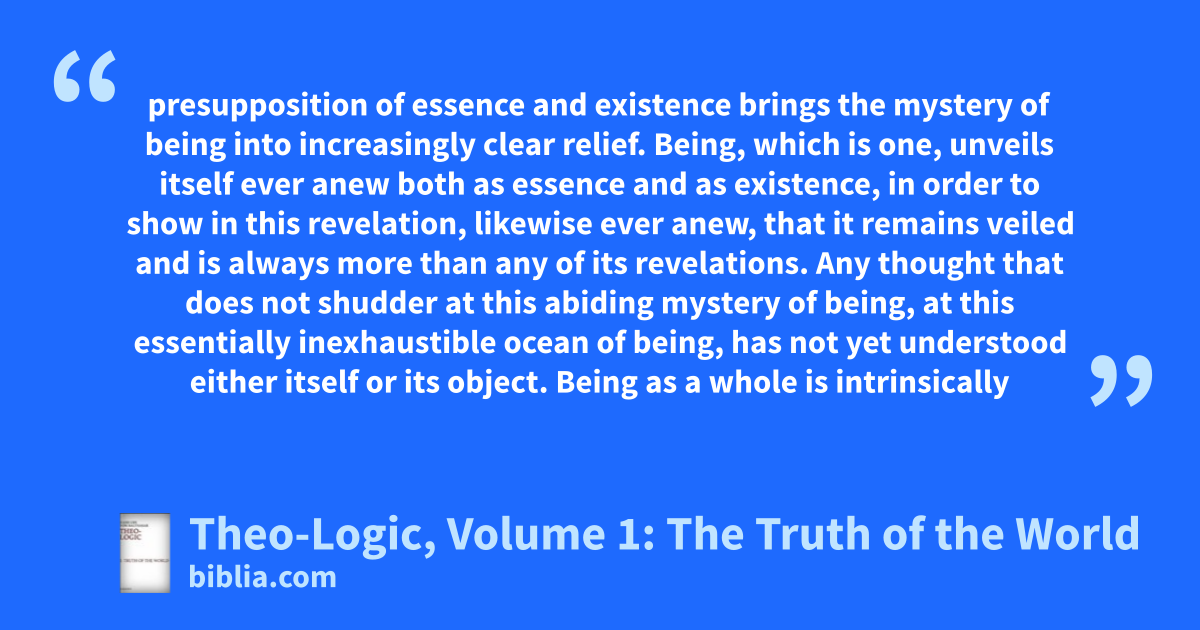 presupposition of essence and existence brings the mystery of being into increasingly clear relief. Being, which is one, unveils itself ever anew both as essence and as existence, in order to show in this revelation, likewise ever anew, that it remains veiled and is always more than any of its revelations. Any thought that does not shudder at this abiding mystery of being, at this essentially inexhaustible ocean of being, has not yet understood either itself or its object. Being as a whole is intrinsically