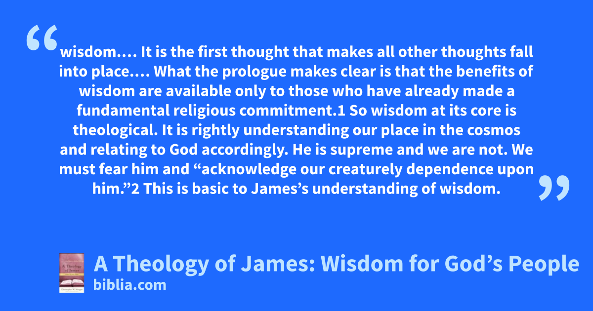 wisdom.… It is the first thought that makes all other thoughts fall into place.… What the prologue makes clear is that the benefits of wisdom are available only to those who have already made a fundamental religious commitment.1 So wisdom at its core is theological. It is rightly understanding our place in the cosmos and relating to God accordingly. He is supreme and we are not. We must fear him and “acknowledge our creaturely dependence upon him.”2 This is basic to James’s understanding of wisdom.