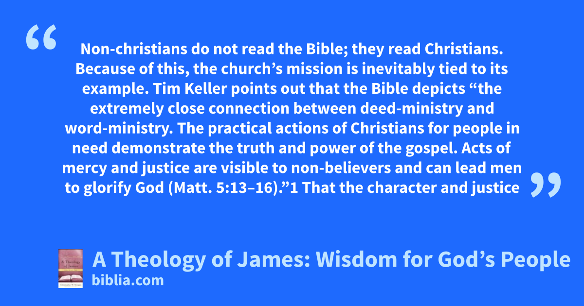 Non-christians do not read the Bible; they read Christians. Because of this, the church’s mission is inevitably tied to its example. Tim Keller points out that the Bible depicts “the extremely close connection between deed-ministry and word-ministry. The practical actions of Christians for people in need demonstrate the truth and power of the gospel. Acts of mercy and justice are visible to non-believers and can lead men to glorify God (Matt. 5:13–16).”1 That the character and justice