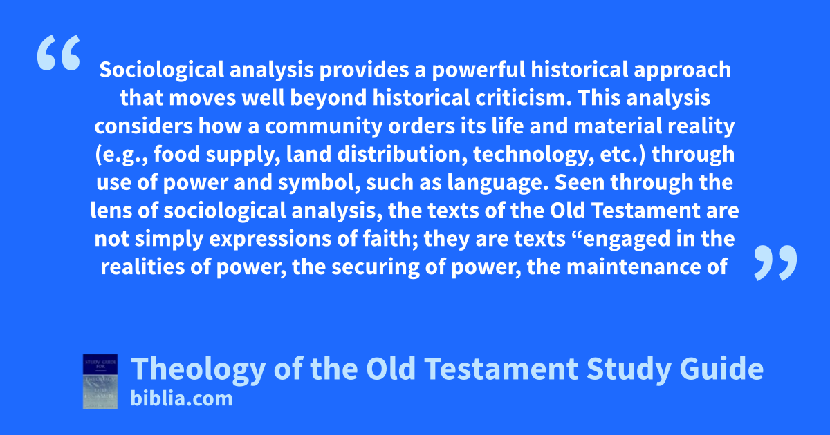 Sociological analysis provides a powerful historical approach that moves well beyond historical criticism. This analysis considers how a community orders its life and material reality (e.g., food supply, land distribution, technology, etc.) through use of power and symbol, such as language. Seen through the lens of sociological analysis, the texts of the Old Testament are not simply expressions of faith; they are texts “engaged in the realities of power, the securing of power, the maintenance of