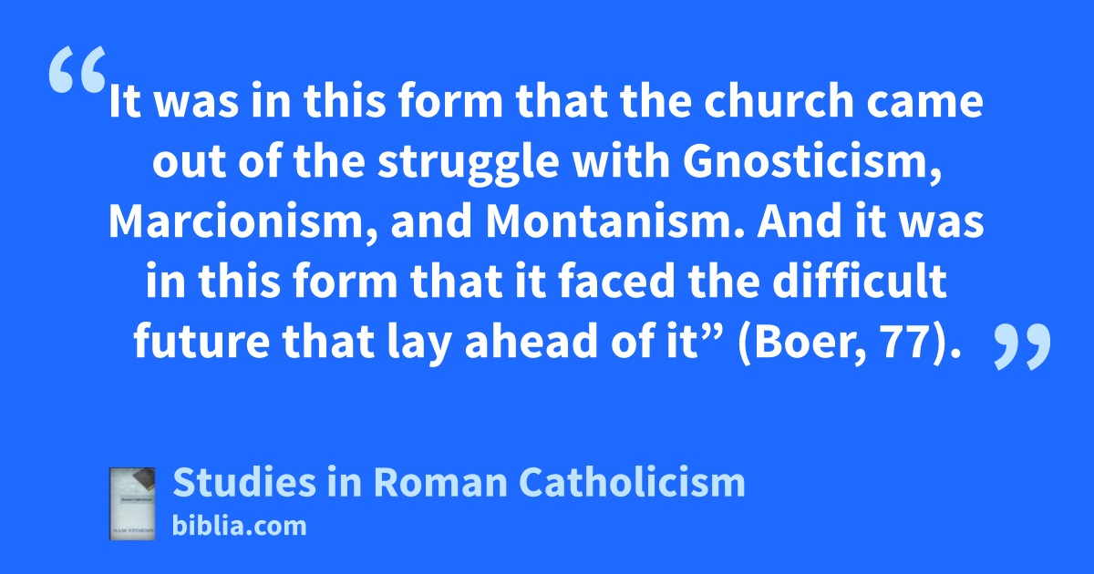 It was in this form that the church came out of the struggle with Gnosticism, Marcionism, and Montanism. And it was in this form that it faced the difficult future that lay ahead of it” (Boer, 77).