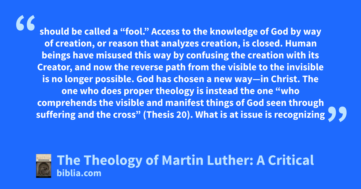 should be called a “fool.” Access to the knowledge of God by way of creation, or reason that analyzes creation, is closed. Human beings have misused this way by confusing the creation with its Creator, and now the reverse path from the visible to the invisible is no longer possible. God has chosen a new way—in Christ. The one who does proper theology is instead the one “who comprehends the visible and manifest things of God seen through suffering and the cross” (Thesis 20). What is at issue is recognizing