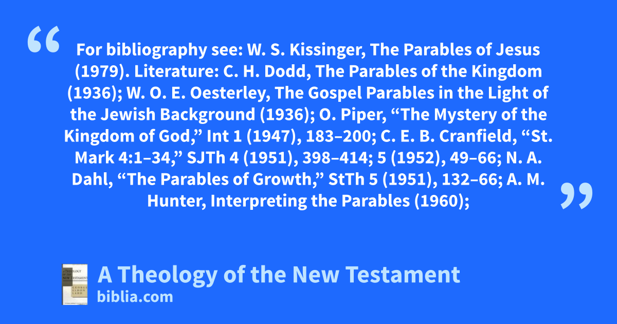 For bibliography see: W. S. Kissinger, The Parables of Jesus (1979). Literature: C. H. Dodd, The Parables of the Kingdom (1936); W. O. E. Oesterley, The Gospel Parables in the Light of the Jewish Background (1936); O. Piper, “The Mystery of the Kingdom of God,” Int 1 (1947), 183–200; C. E. B. Cranfield, “St. Mark 4:1–34,” SJTh 4 (1951), 398–414; 5 (1952), 49–66; N. A. Dahl, “The Parables of Growth,” StTh 5 (1951), 132–66; A. M. Hunter, Interpreting the Parables (1960);
