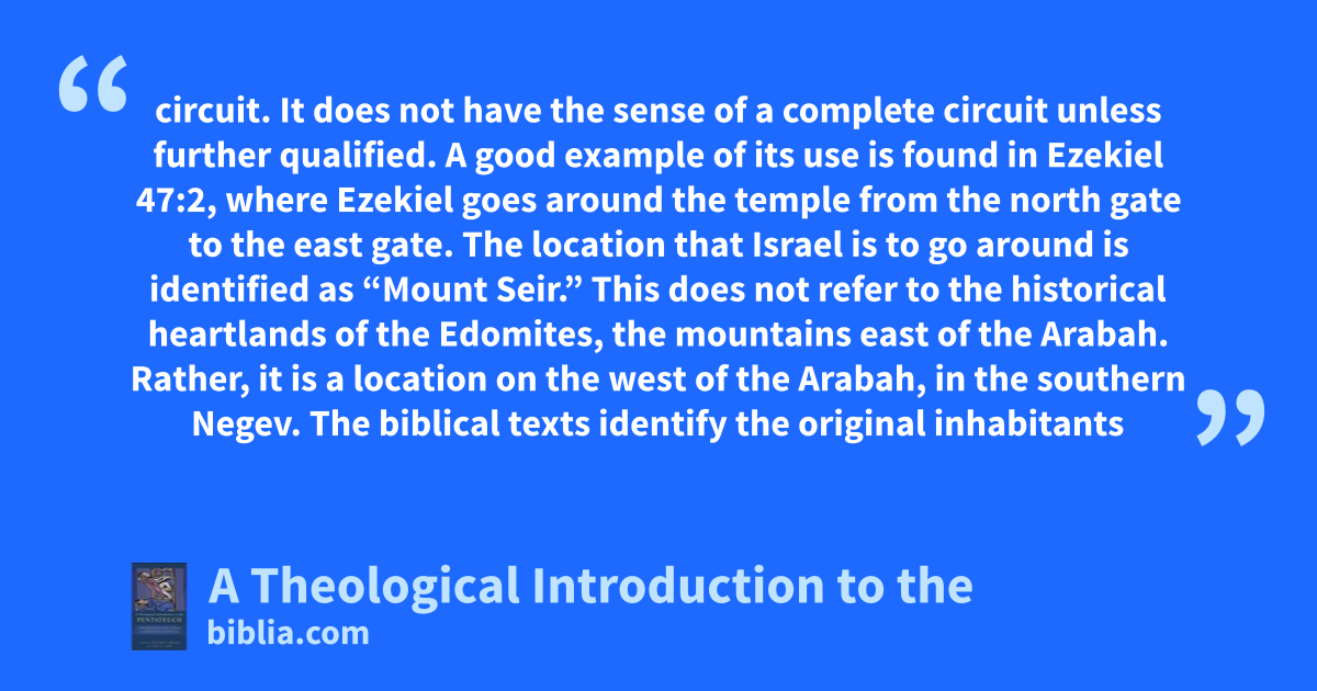 circuit. It does not have the sense of a complete circuit unless further qualified. A good example of its use is found in Ezekiel 47:2, where Ezekiel goes around the temple from the north gate to the east gate. The location that Israel is to go around is identified as “Mount Seir.” This does not refer to the historical heartlands of the Edomites, the mountains east of the Arabah. Rather, it is a location on the west of the Arabah, in the southern Negev. The biblical texts identify the original inhabitants