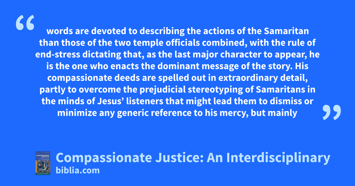 words are devoted to describing the actions of the Samaritan than those of the two temple officials combined, with the rule of end-stress dictating that, as the last major character to appear, he is the one who enacts the dominant message of the story. His compassionate deeds are spelled out in extraordinary detail, partly to overcome the prejudicial stereotyping of Samaritans in the minds of Jesus’ listeners that might lead them to dismiss or minimize any generic reference to his mercy, but mainly