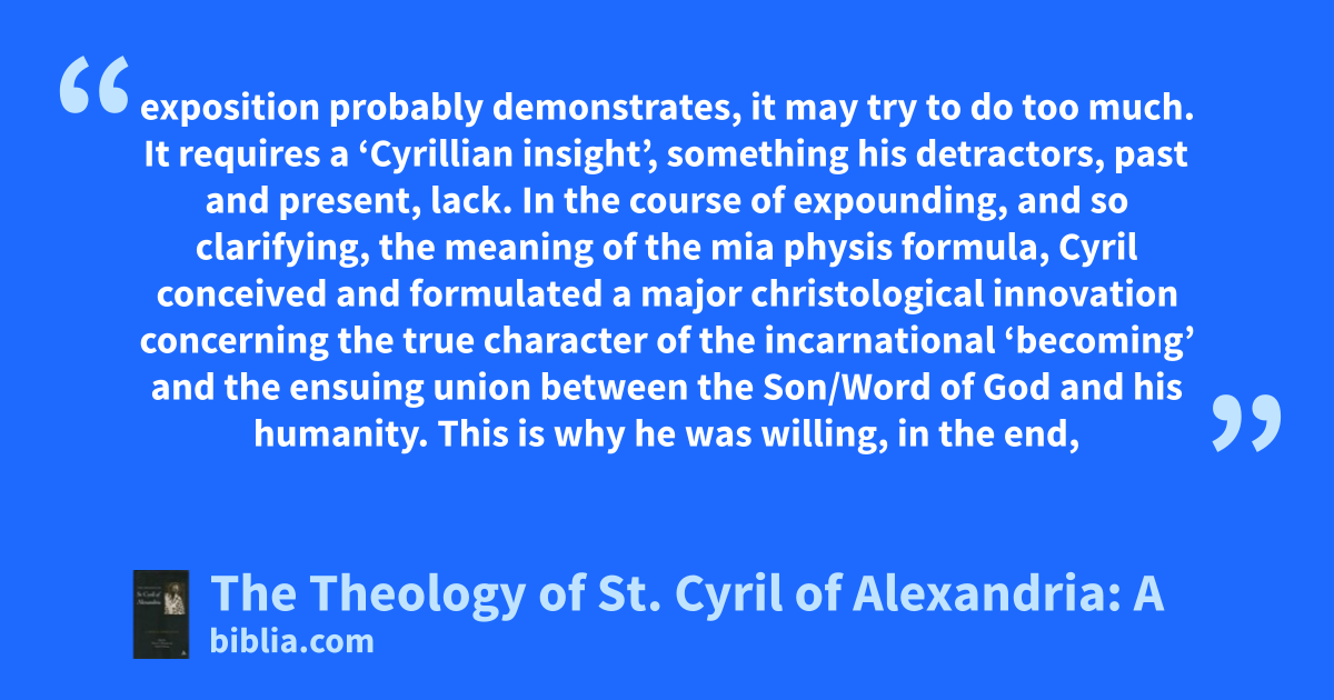 exposition probably demonstrates, it may try to do too much. It requires a ‘Cyrillian insight’, something his detractors, past and present, lack. In the course of expounding, and so clarifying, the meaning of the mia physis formula, Cyril conceived and formulated a major christological innovation concerning the true character of the incarnational ‘becoming’ and the ensuing union between the Son/Word of God and his humanity. This is why he was willing, in the end,