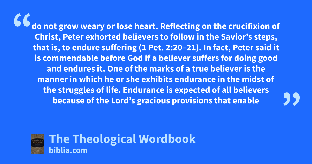 do not grow weary or lose heart. Reflecting on the crucifixion of Christ, Peter exhorted believers to follow in the Savior’s steps, that is, to endure suffering (1 Pet. 2:20–21). In fact, Peter said it is commendable before God if a believer suffers for doing good and endures it. One of the marks of a true believer is the manner in which he or she exhibits endurance in the midst of the struggles of life. Endurance is expected of all believers because of the Lord’s gracious provisions that enable