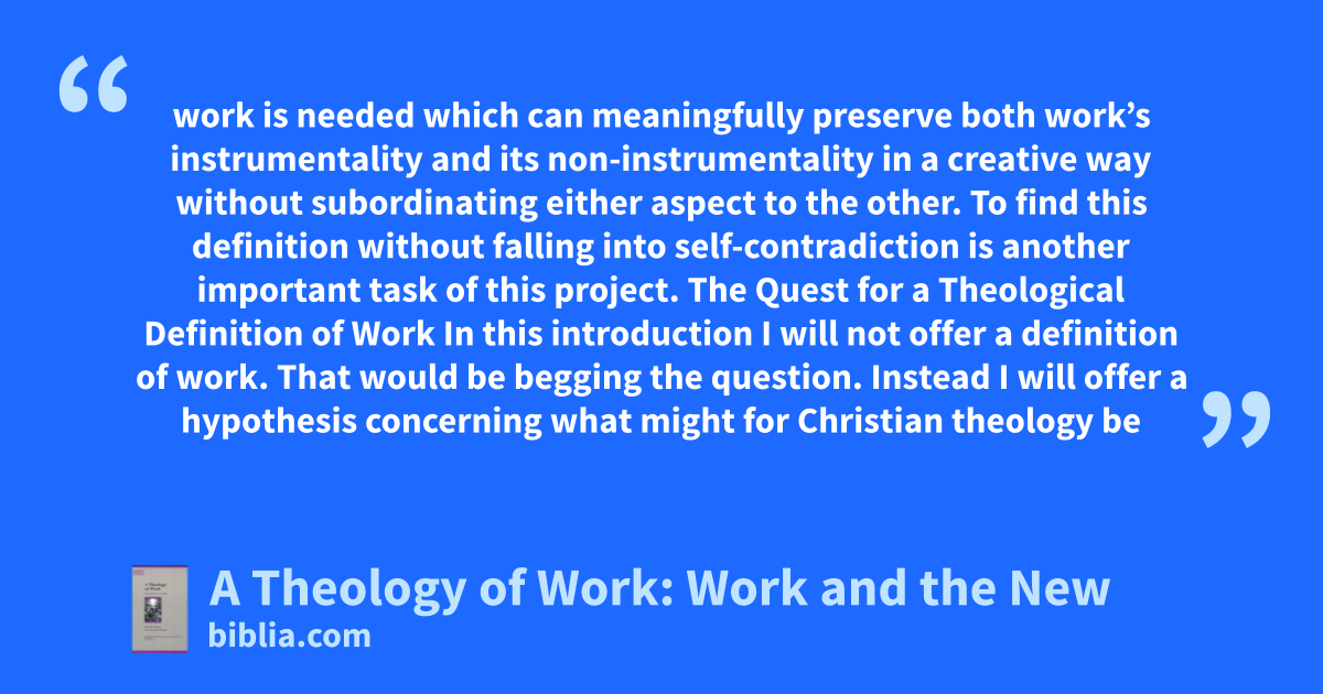 work is needed which can meaningfully preserve both work’s instrumentality and its non-instrumentality in a creative way without subordinating either aspect to the other. To find this definition without falling into self-contradiction is another important task of this project. The Quest for a Theological Definition of Work In this introduction I will not offer a definition of work. That would be begging the question. Instead I will offer a hypothesis concerning what might for Christian theology be