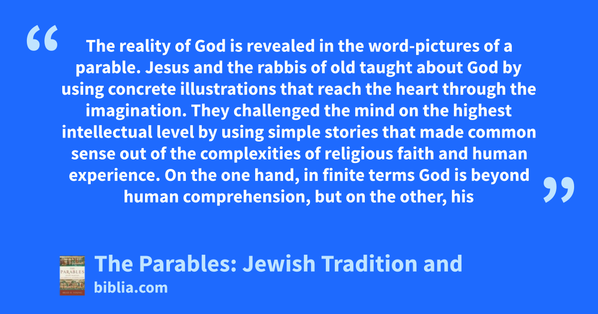 The reality of God is revealed in the word-pictures of a parable. Jesus and the rabbis of old taught about God by using concrete illustrations that reach the heart through the imagination. They challenged the mind on the highest intellectual level by using simple stories that made common sense out of the complexities of religious faith and human experience. On the one hand, in finite terms God is beyond human comprehension, but on the other, his