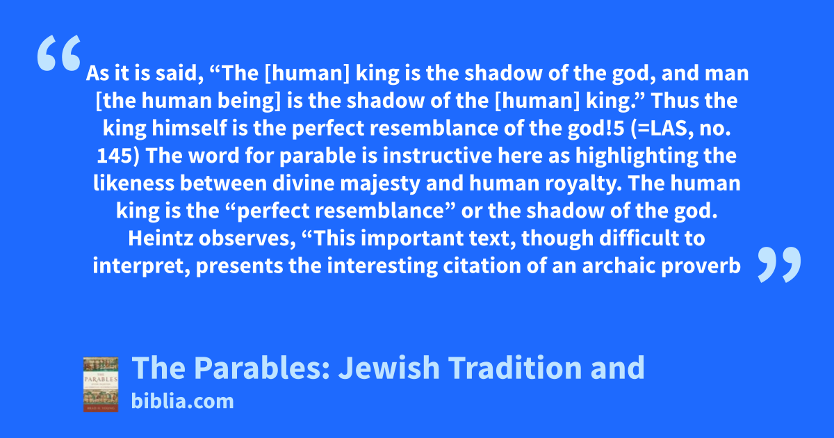 As it is said, “The [human] king is the shadow of the god, and man [the human being] is the shadow of the [human] king.” Thus the king himself is the perfect resemblance of the god!5 (=LAS, no. 145) The word for parable is instructive here as highlighting the likeness between divine majesty and human royalty. The human king is the “perfect resemblance” or the shadow of the god. Heintz observes, “This important text, though difficult to interpret, presents the interesting citation of an archaic proverb