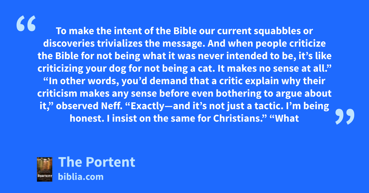 To make the intent of the Bible our current squabbles or discoveries trivializes the message. And when people criticize the Bible for not being what it was never intended to be, it’s like criticizing your dog for not being a cat. It makes no sense at all.” “In other words, you’d demand that a critic explain why their criticism makes any sense before even bothering to argue about it,” observed Neff. “Exactly—and it’s not just a tactic. I’m being honest. I insist on the same for Christians.” “What