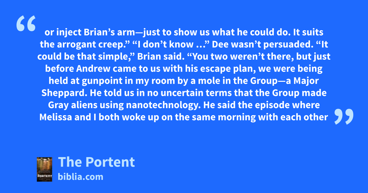 or inject Brian’s arm—just to show us what he could do. It suits the arrogant creep.” “I don’t know …” Dee wasn’t persuaded. “It could be that simple,” Brian said. “You two weren’t there, but just before Andrew came to us with his escape plan, we were being held at gunpoint in my room by a mole in the Group—a Major Sheppard. He told us in no uncertain terms that the Group made Gray aliens using nanotechnology. He said the episode where Melissa and I both woke up on the same morning with each other