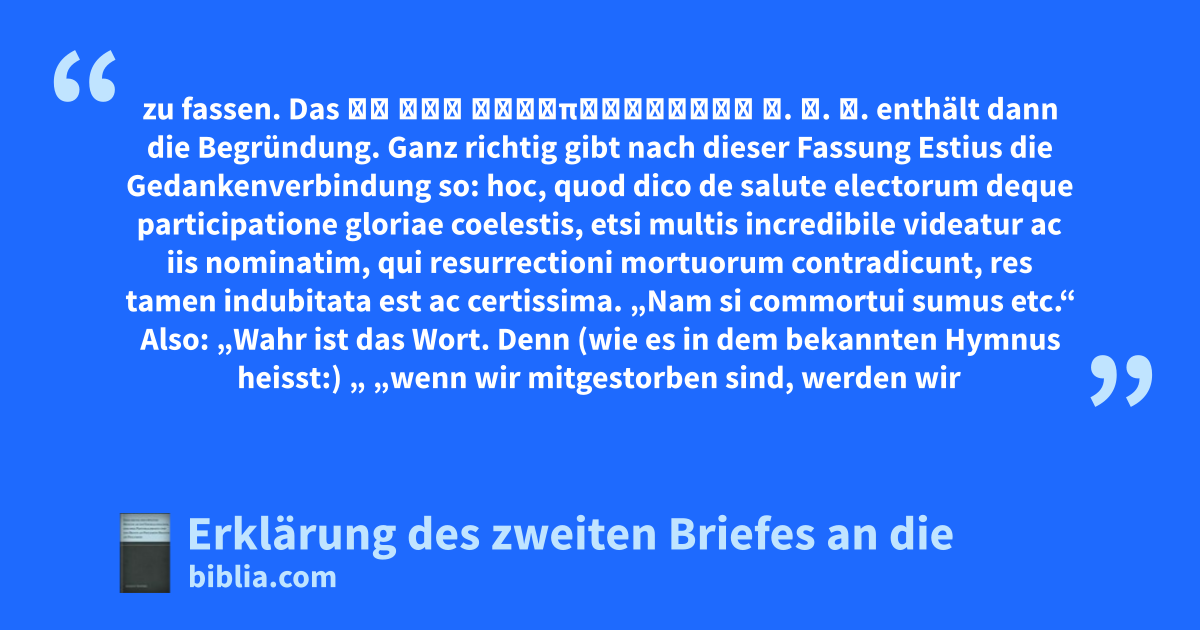 zu fassen. Das εἰ γὰρ συναπεθάνομεν κ. τ. λ. enthält dann die Begründung. Ganz richtig gibt nach dieser Fassung Estius die Gedankenverbindung so: hoc, quod dico de salute electorum deque participatione gloriae coelestis, etsi multis incredibile videatur ac iis nominatim, qui resurrectioni mortuorum contradicunt, res tamen indubitata est ac certissima. „Nam si commortui sumus etc.“ Also: „Wahr ist das Wort. Denn (wie es in dem bekannten Hymnus heisst:) „ „wenn wir mitgestorben sind, werden wir