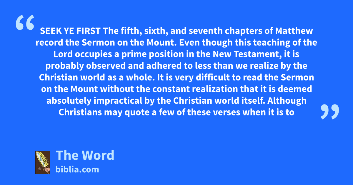 SEEK YE FIRST The fifth, sixth, and seventh chapters of Matthew record the Sermon on the Mount. Even though this teaching of the Lord occupies a prime position in the New Testament, it is probably observed and adhered to less than we realize by the Christian world as a whole. It is very difficult to read the Sermon on the Mount without the constant realization that it is deemed absolutely impractical by the Christian world itself. Although Christians may quote a few of these verses when it is to