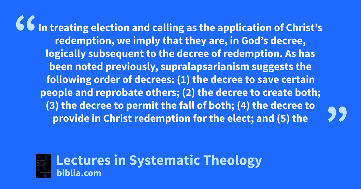 In treating election and calling as the application of Christ’s redemption, we imply that they are, in God’s decree, logically subsequent to the decree of redemption. As has been noted previously, supralapsarianism suggests the following order of decrees: (1) the decree to save certain people and reprobate others; (2) the decree to create both; (3) the decree to permit the fall of both; (4) the decree to provide in Christ redemption for the elect; and (5) the