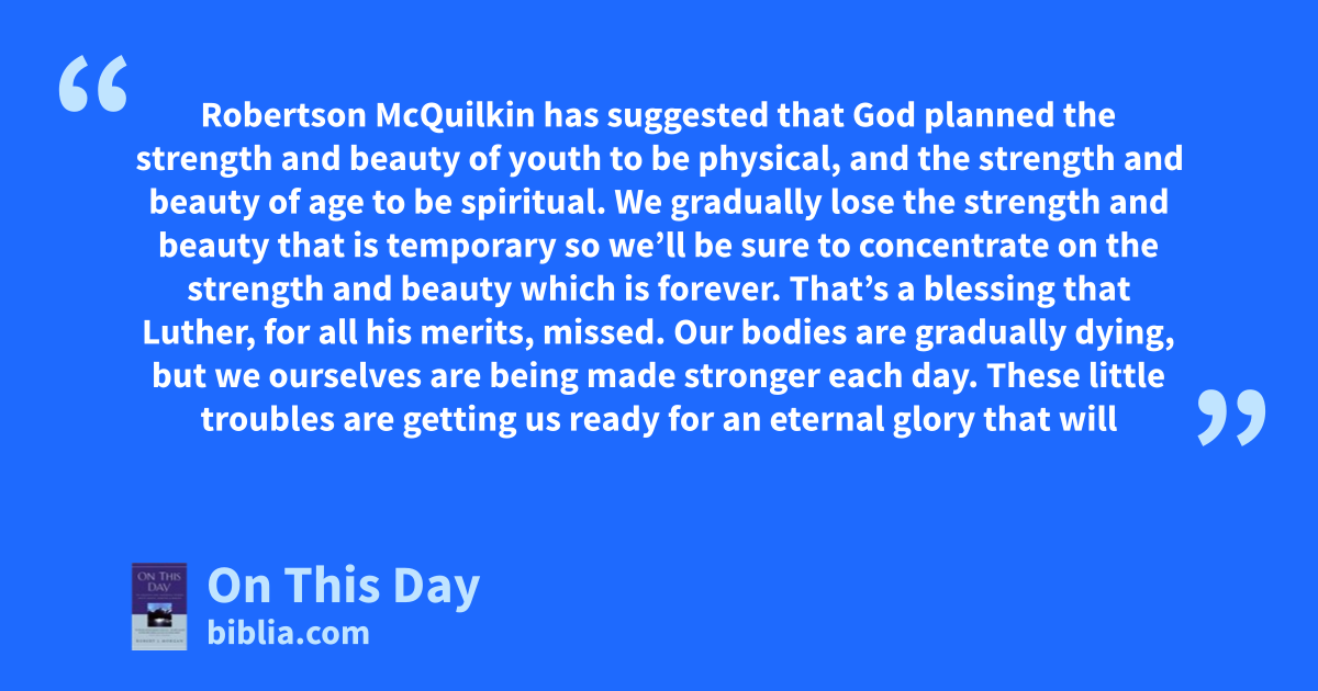Robertson McQuilkin has suggested that God planned the strength and beauty of youth to be physical, and the strength and beauty of age to be spiritual. We gradually lose the strength and beauty that is temporary so we’ll be sure to concentrate on the strength and beauty which is forever. That’s a blessing that Luther, for all his merits, missed. Our bodies are gradually dying, but we ourselves are being made stronger each day. These little troubles are getting us ready for an eternal glory that will