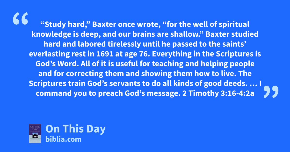 “Study hard,” Baxter once wrote, “for the well of spiritual knowledge is deep, and our brains are shallow.” Baxter studied hard and labored tirelessly until he passed to the saints’ everlasting rest in 1691 at age 76. Everything in the Scriptures is God’s Word. All of it is useful for teaching and helping people and for correcting them and showing them how to live. The Scriptures train God’s servants to do all kinds of good deeds. … I command you to preach God’s message. 2 Timothy 3:16-4:2a