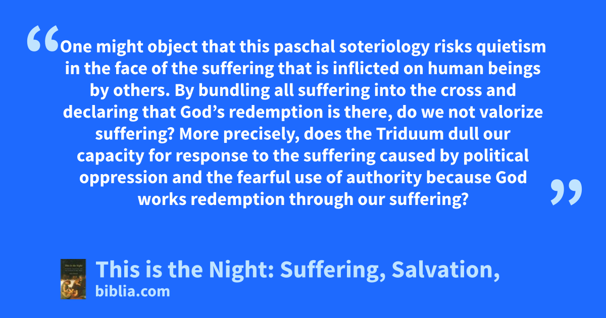 One might object that this paschal soteriology risks quietism in the face of the suffering that is inflicted on human beings by others. By bundling all suffering into the cross and declaring that God’s redemption is there, do we not valorize suffering? More precisely, does the Triduum dull our capacity for response to the suffering caused by political oppression and the fearful use of authority because God works redemption through our suffering?