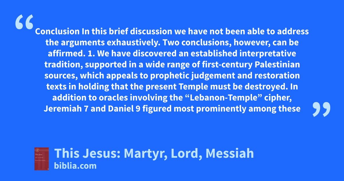 Conclusion In this brief discussion we have not been able to address the arguments exhaustively. Two conclusions, however, can be affirmed. 1. We have discovered an established interpretative tradition, supported in a wide range of first-century Palestinian sources, which appeals to prophetic judgement and restoration texts in holding that the present Temple must be destroyed. In addition to oracles involving the “Lebanon-Temple” cipher, Jeremiah 7 and Daniel 9 figured most prominently among these