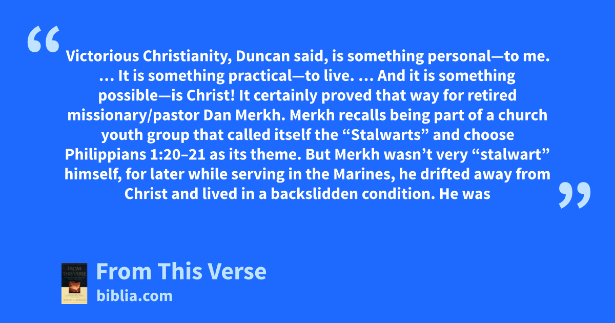 Victorious Christianity, Duncan said, is something personal—to me. … It is something practical—to live. … And it is something possible—is Christ! It certainly proved that way for retired missionary/pastor Dan Merkh. Merkh recalls being part of a church youth group that called itself the “Stalwarts” and choose Philippians 1:20–21 as its theme. But Merkh wasn’t very “stalwart” himself, for later while serving in the Marines, he drifted away from Christ and lived in a backslidden condition. He was