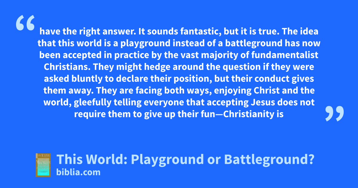 There was a time, Tozer says, when Christianity exercised a dominant influence over the thinking of our forefathers, when they knew the world was a battlefield. They believed in sin, the devil, and hell as constituting one force pitted against the other force of God and righteousness and heaven. People today, however, think of the world, Tozer laments, not as a battleground, but as a playground;...